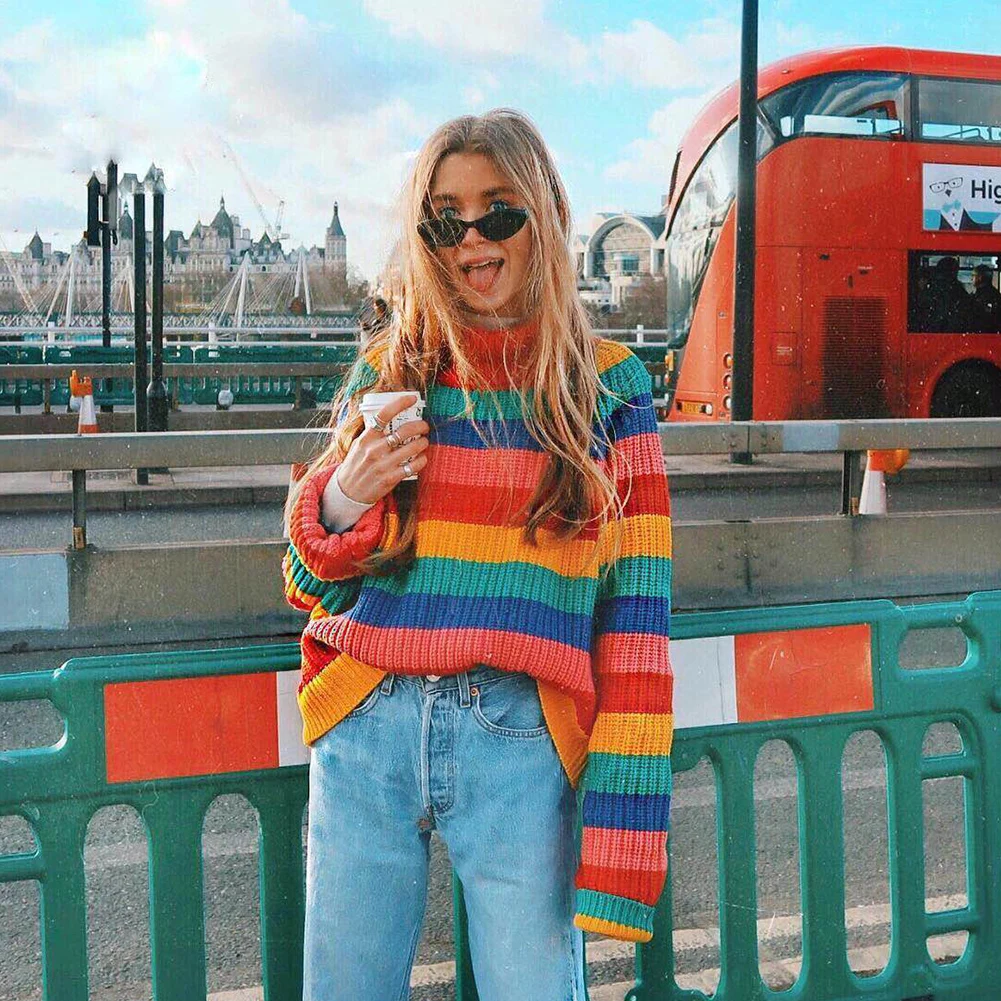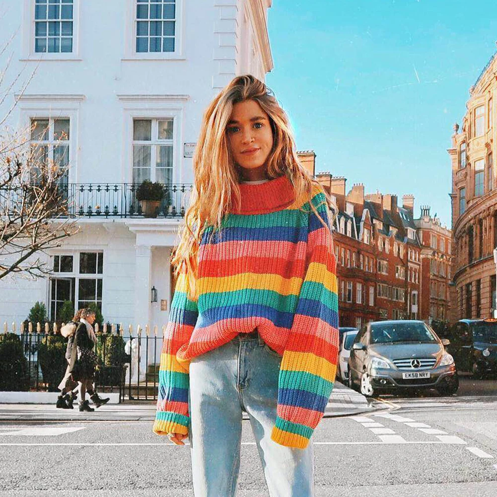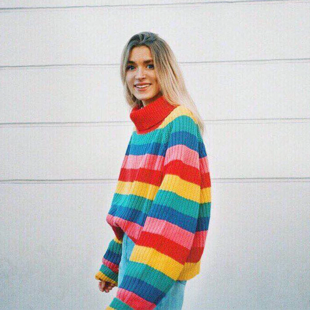 Special Offer Sweter z golfem kobieta jesień zima gorący tęczowy pasek Pull Femme luźny sweter z dzianiny dla pani przyczynowy zimowy sweter kobiet Discount 42% Today!