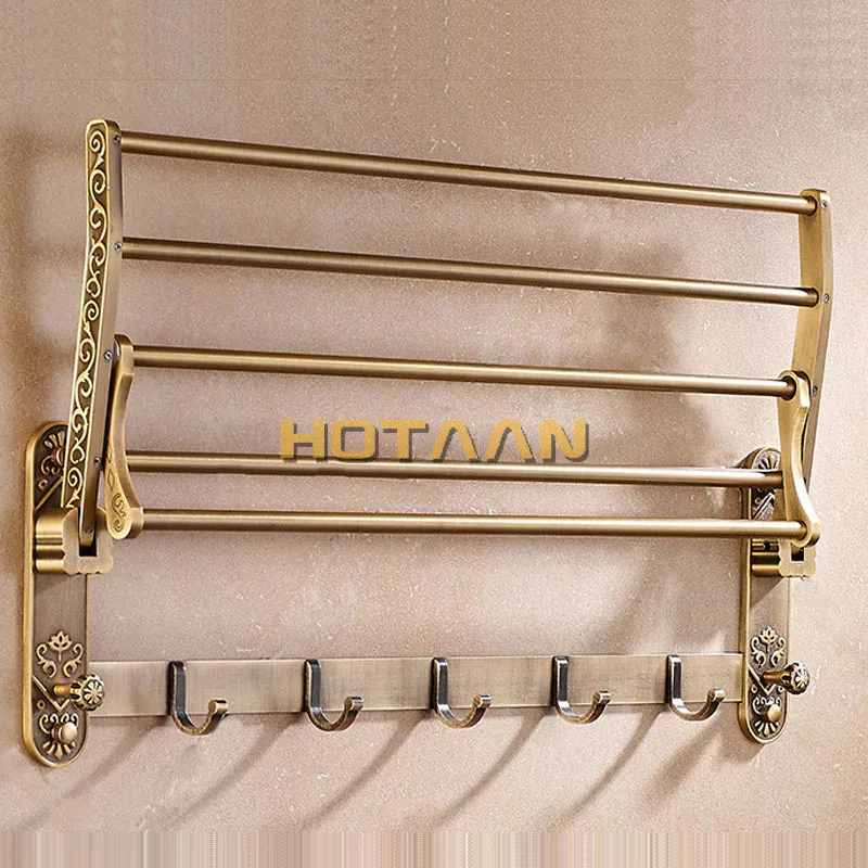 Special Offer Aluminiowy składany antyczny mosiężny wieszak na ręczniki aktywny uchwyt na ręcznik łazienkowy podwójna półka na ręczniki z haczykami akcesoria łazienkowe Discount 41% Today!