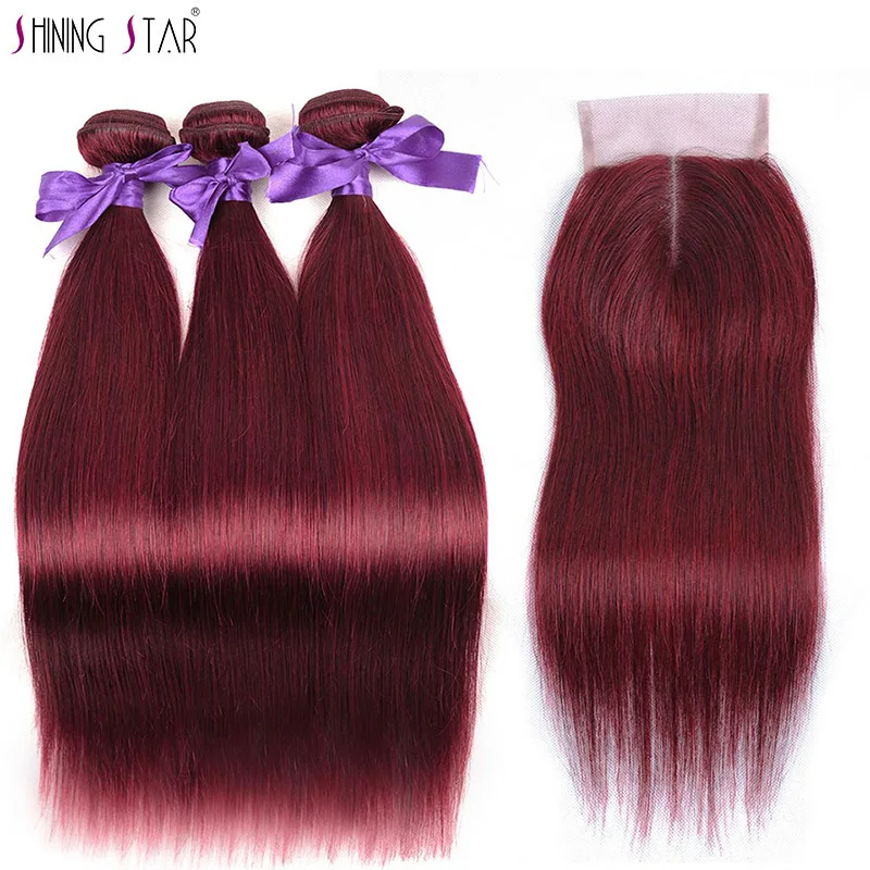 Special Offer Shining Star kolorowe 99J brazylijski bordowy wiązki z zamknięciem prosto czerwony ludzkich włosów 3 wiązki z zamknięciem nie Remy włosy wyplata Discount 47% Today!