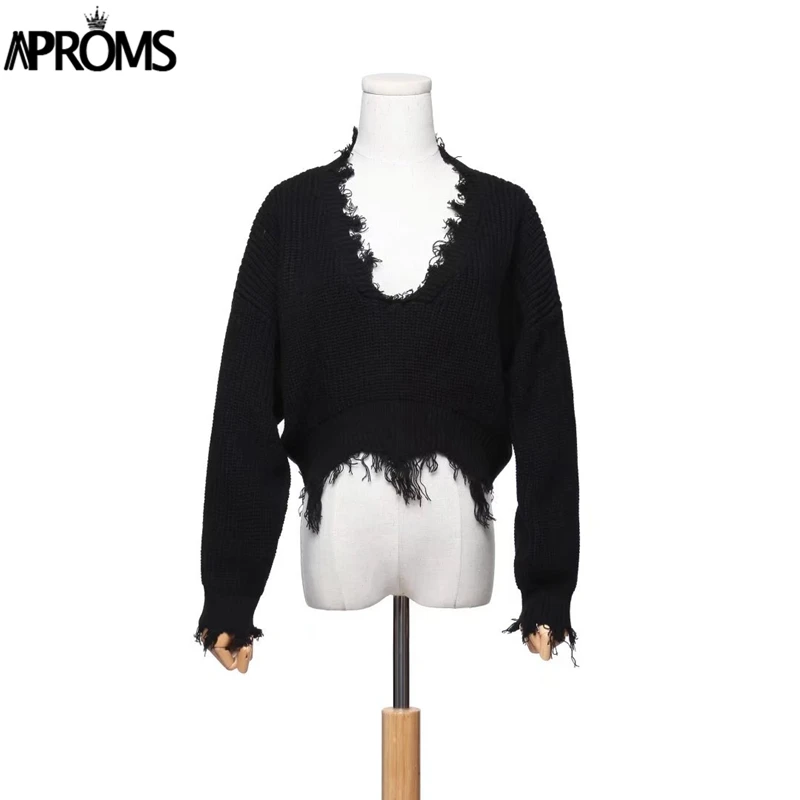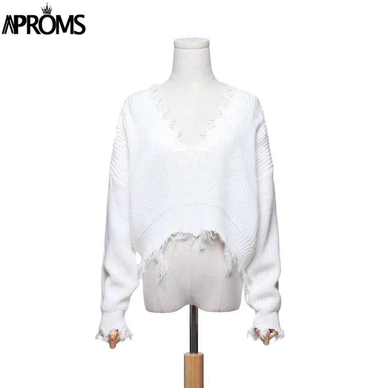 Special Offer Aproms Tassel głębokie V dziergany sweter kobiet jesień zima biały z długim rękawem dzianiny szydełkowe swetry kobiety przycięte Jumper Pull Top Discount 50% Today!