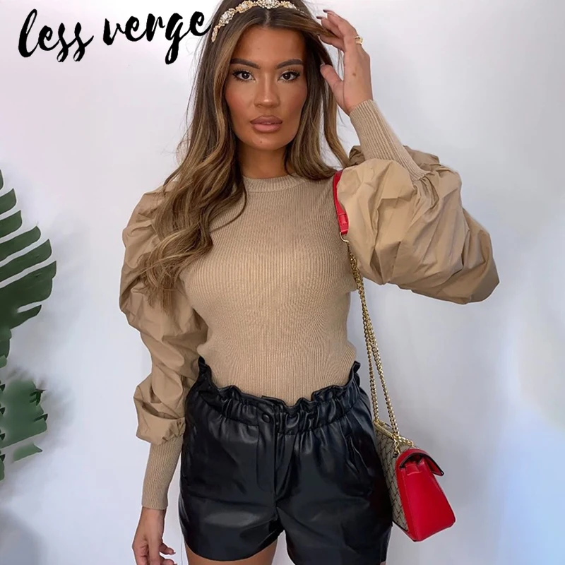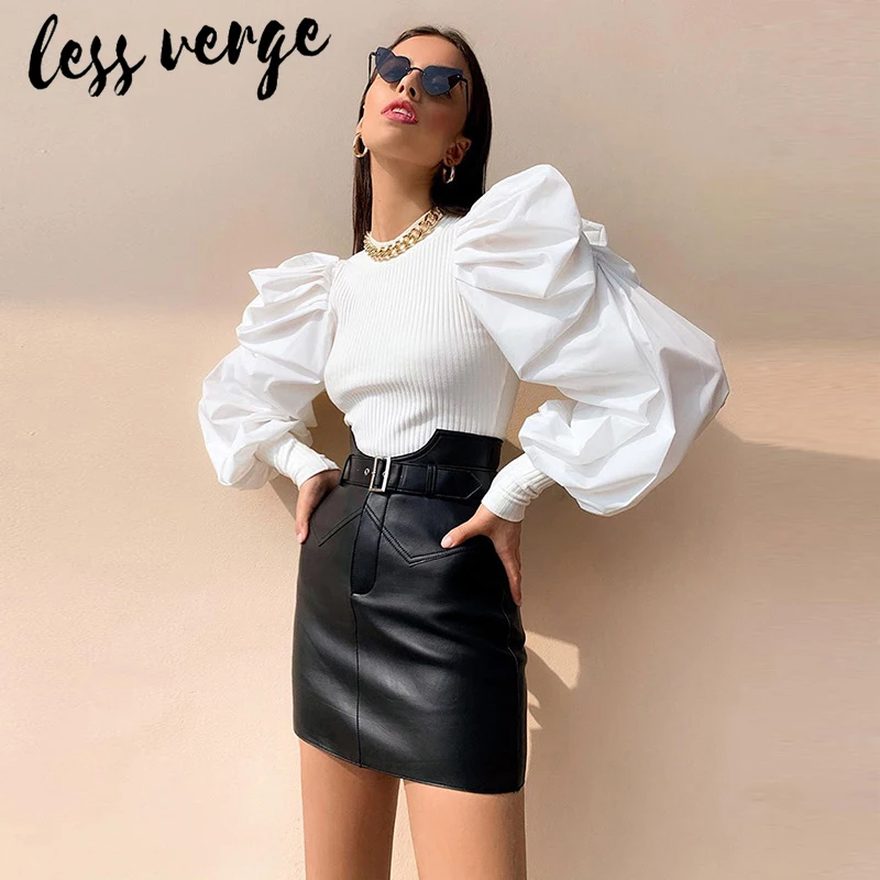 Special Offer Lessverge bufiaste rękawy vintage bluzka z dzianiny top kobiety jesienno zimowa eleganckie czarne koszule damskie białe body kombinezony blusas Discount 48% Today!