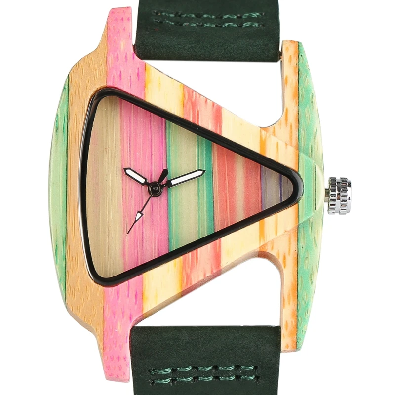 Special Offer Unikalne kolorowe drewniany zegarek kreatywny kształt trójkąta Dial godziny zegar kobiety skóra quartz bransoletka kwarcowy zegarek damski na rękę Reloj Mujer Discount 45% Today!