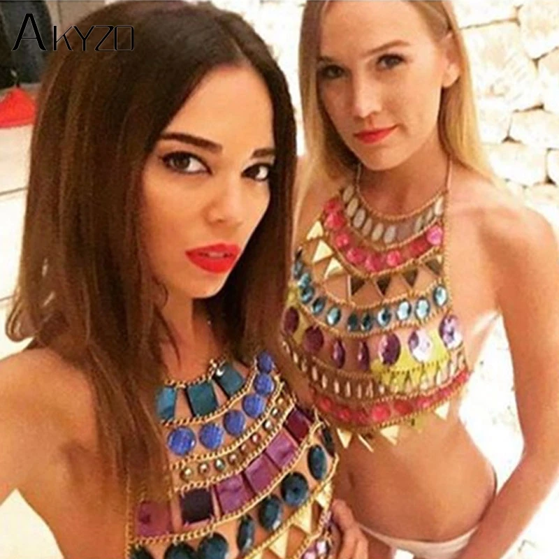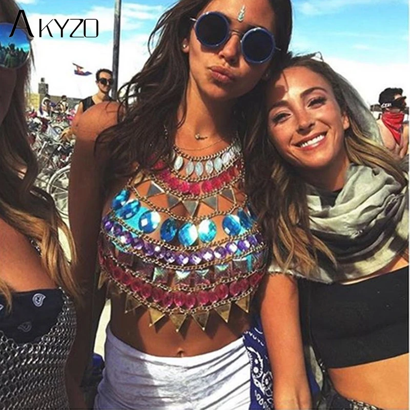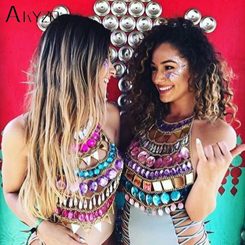 Special Offer AKYZO kobiety kolorowe akrylowe kryształowe podkoszulki festiwalowe plaża świecący szalony klejnot cekiny O szyi impreza w klubie nocnym krótki top na ramiączkach Discount 47% Today!